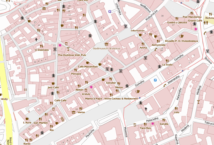 In der näheren Umgebung befinden sich berühmte Plätzen wie beispielsweise Hlavné námestie , Čumil (socha) und Primatialpalais. Oft besucht sind folgende Stadtpläne: Schlossgrund , St. Elisabeth , Hlavné námestie und Zoologischer Garten Bratislava